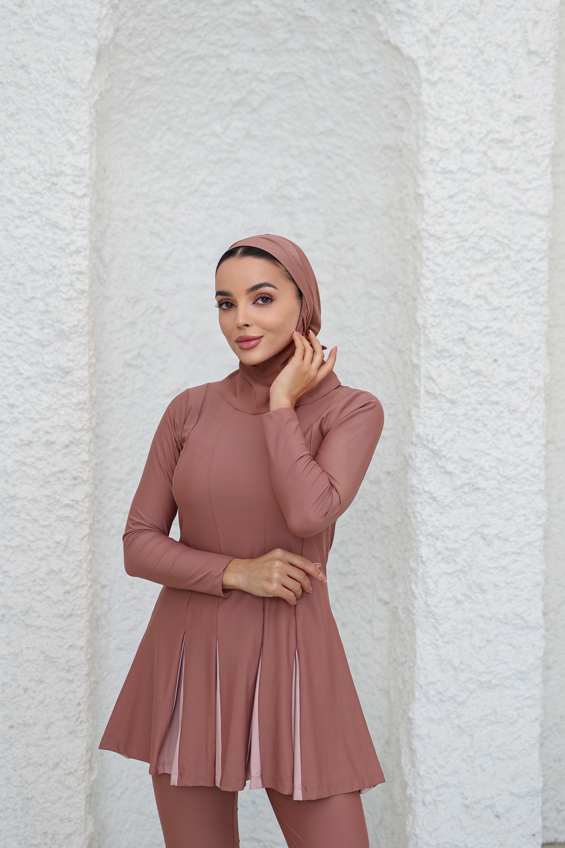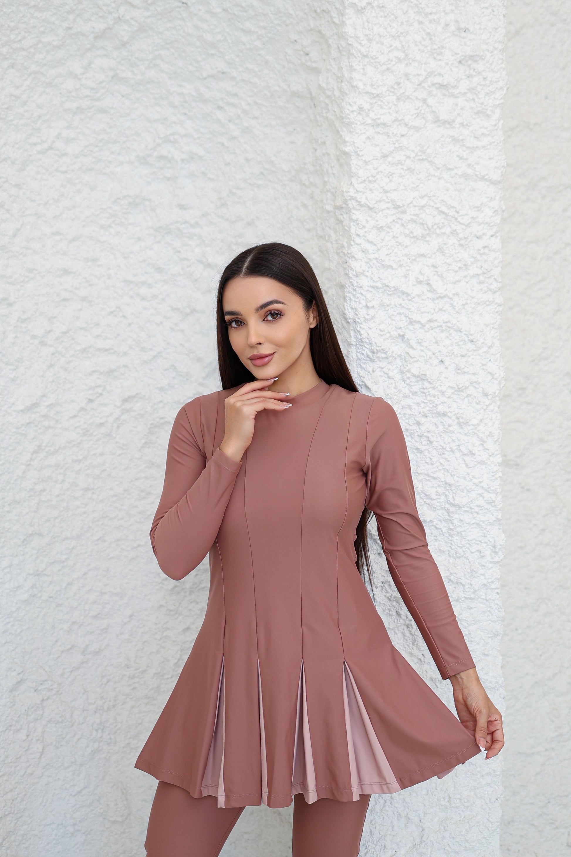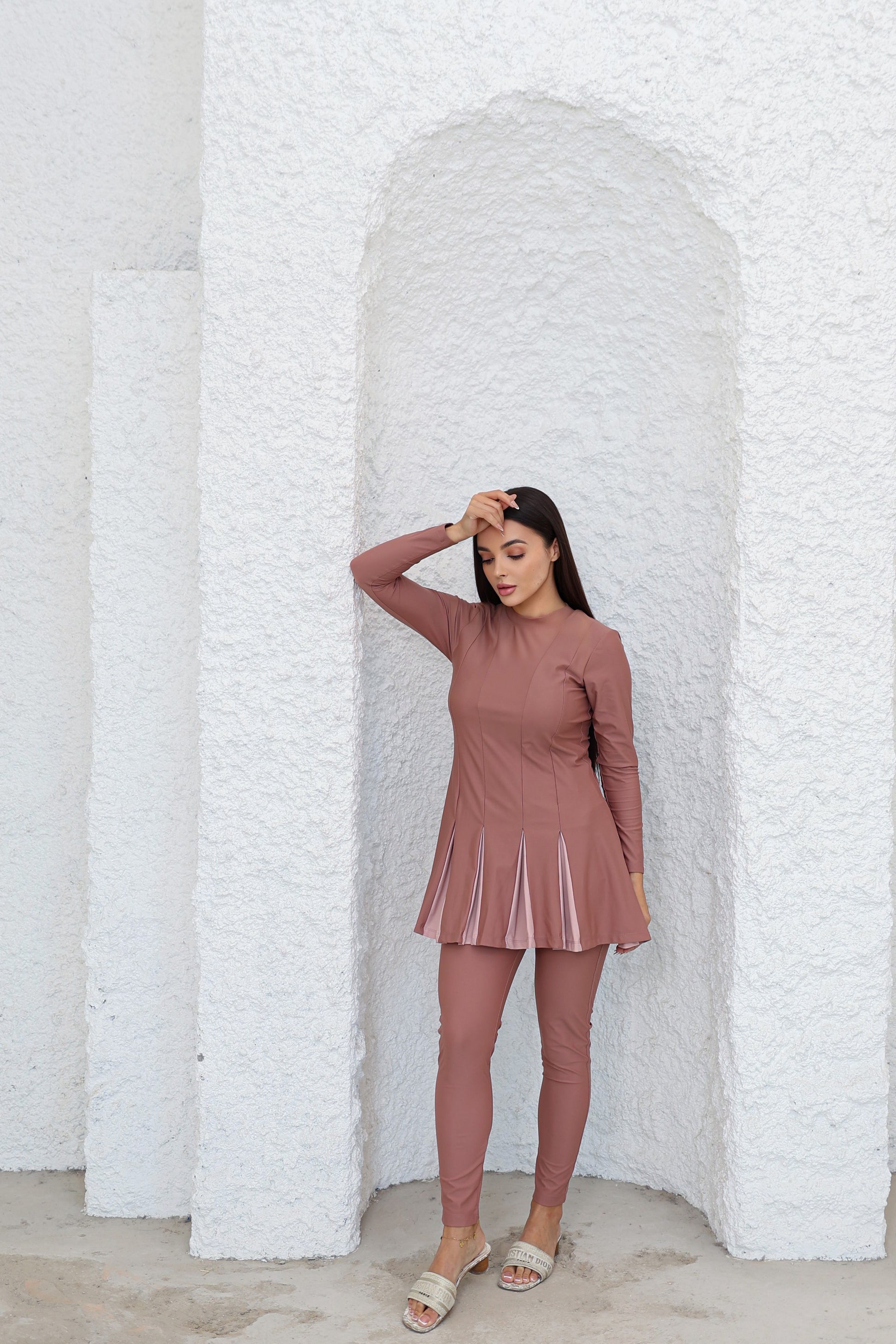 Architectural in its cut and graceful in its movement, the rose mirage set is an ode to our feminine silhouette. Crafted in a duo tone rose palette, it features sculpted box pleats that cascade effortlessly to flatter all body shapes.